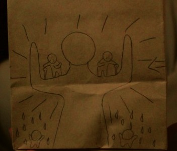 兒兒說:這是憑著我小時候你買了一本繪本書,所得到的靈感,叫什麼什麼,好像跟宗教有關之類的..