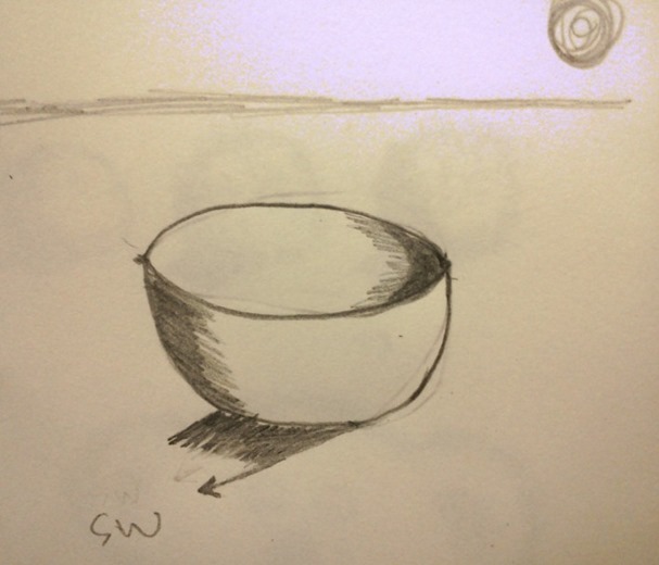 3.設置光源,用西南向引導線畫出投射陰影,並畫下基底線,用從深至淺的調合畫出碗的陰影