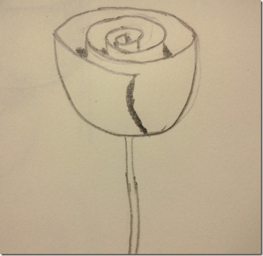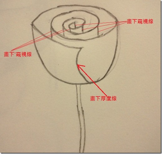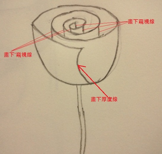 步驟4:在玫瑰花瓣中心區畫下第一條窺視線,並依序完全其他窺視線,最後加上厚度線