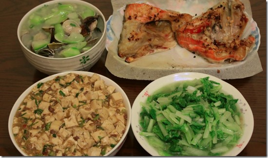 蒜烤鮭魚頭、蛤蜊絲瓜、不麻的辣豆腐、清炒小白菜