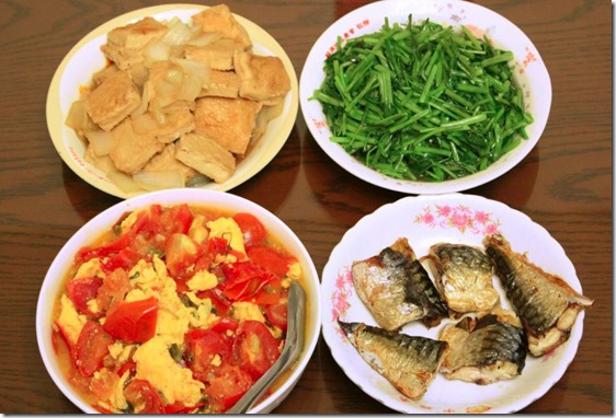 洋蔥燒百頁、乾煎鯖魚、蕃茄炒蛋、清炒空心菜