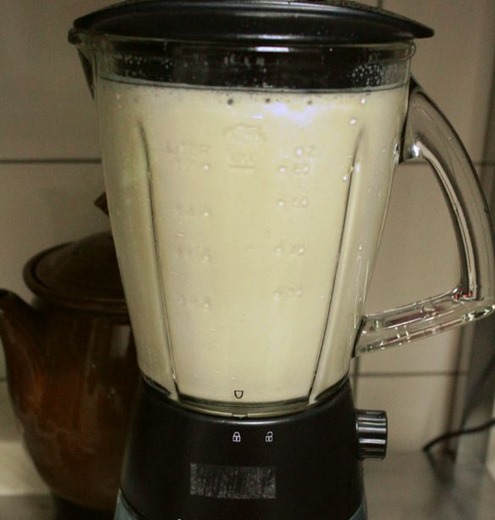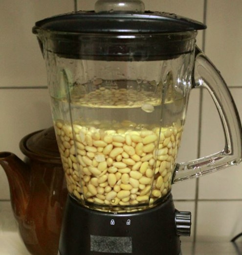 將全部豆子置入果汁機,一開始阿母先加800cc的水,想說挑掉一些豆子,