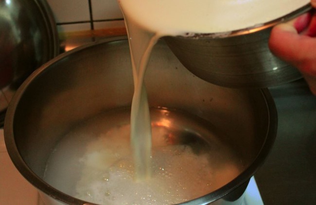 這次參考格友方法,以重量1比10的比例來做,在豆漿一煮開時