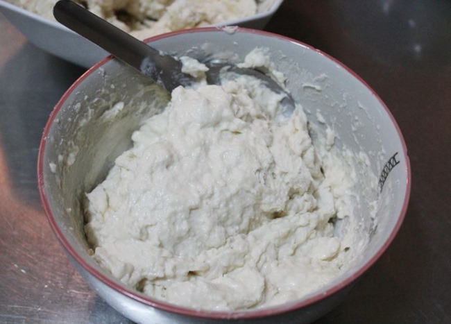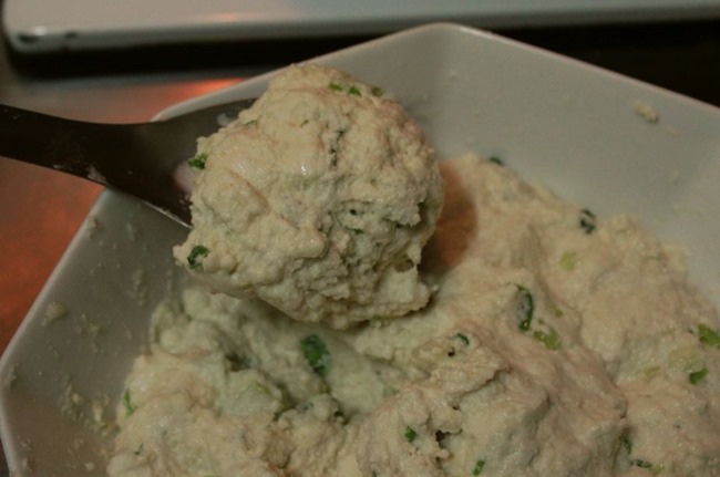 再把攪拌好的麵粉糊倒入豆渣裡,充份攪拌,也可以用手去和,稠度如下圖