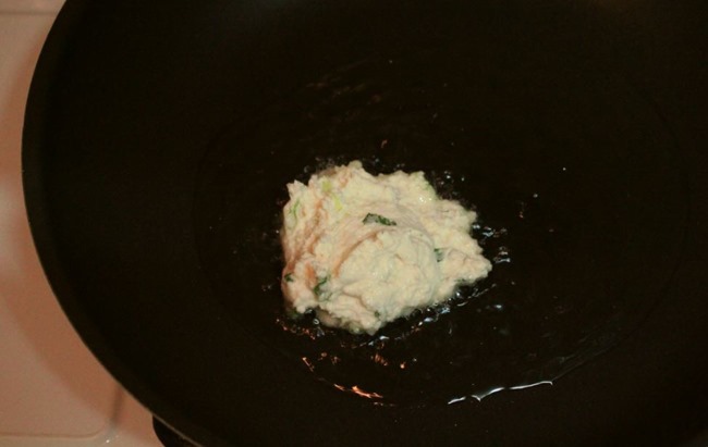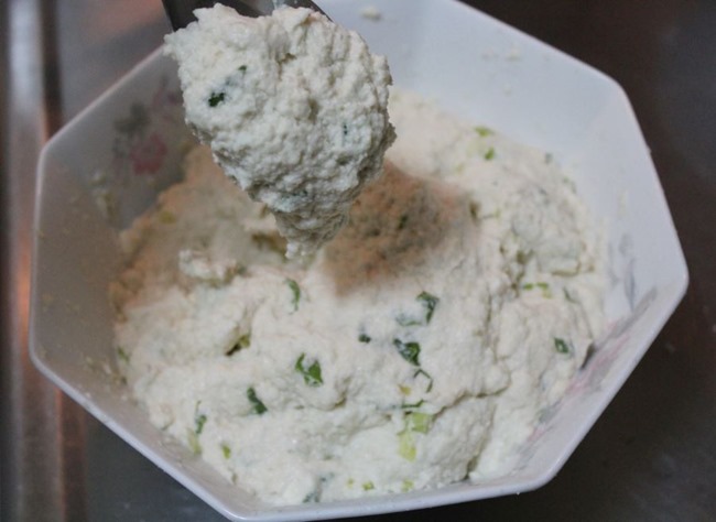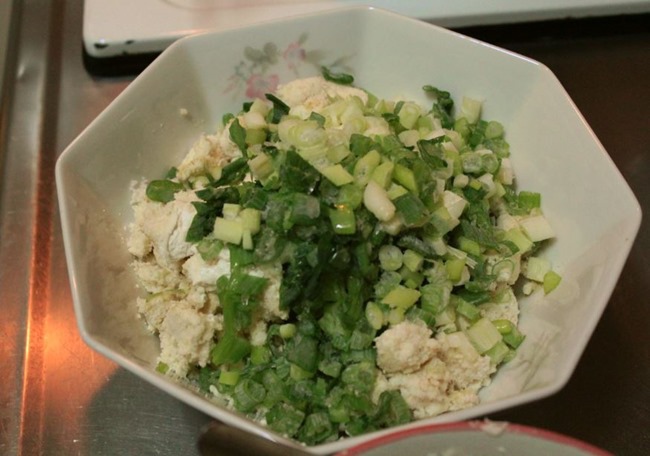 然後鹽5小匙、糊椒粉適量、蔥適量、油2T,依序加入豆渣裡略做攪拌