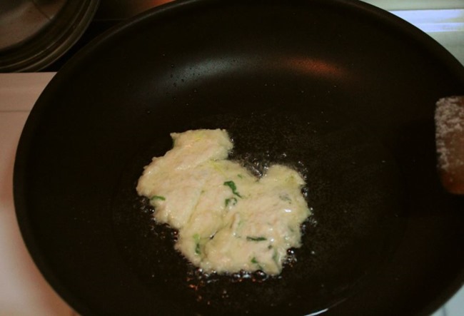 放到微熱的油鍋裡,雖然多吃油不益健康,但豆餅要半煎半炸才會香酥